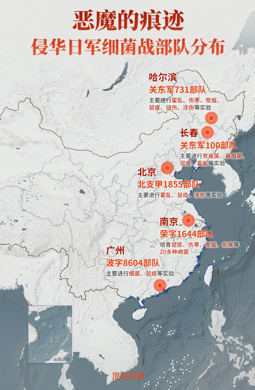 731部队并非中国境内唯一一支日军细菌战部队。实际上,日本在侵华期间先后在中国东北、华北、华中、华南都建立有颇成规模且行动隐秘的部队。在日军战败之际,这些军队的存在往往被有意识地销毁、抹去,但这张巨大的罪恶网络在今天仍保存有痕迹。
